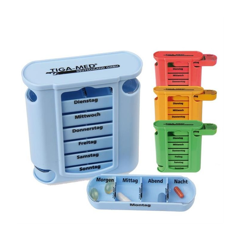 Medikamenten-Wochendispenser der Firma Tiga-Med mit 7 Schiebefächern für die Wochentage und einer weiteren Unterteilung Morgen, Mittag, Abend, Nacht.