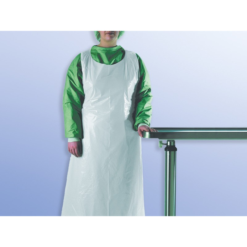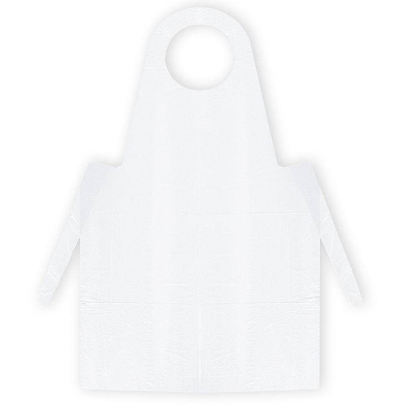 • Weiße Einmalschürze geriffelt aus PE/Thermoplast (niedere Dichte) mit einer Materialstärke von 0,02 mm.