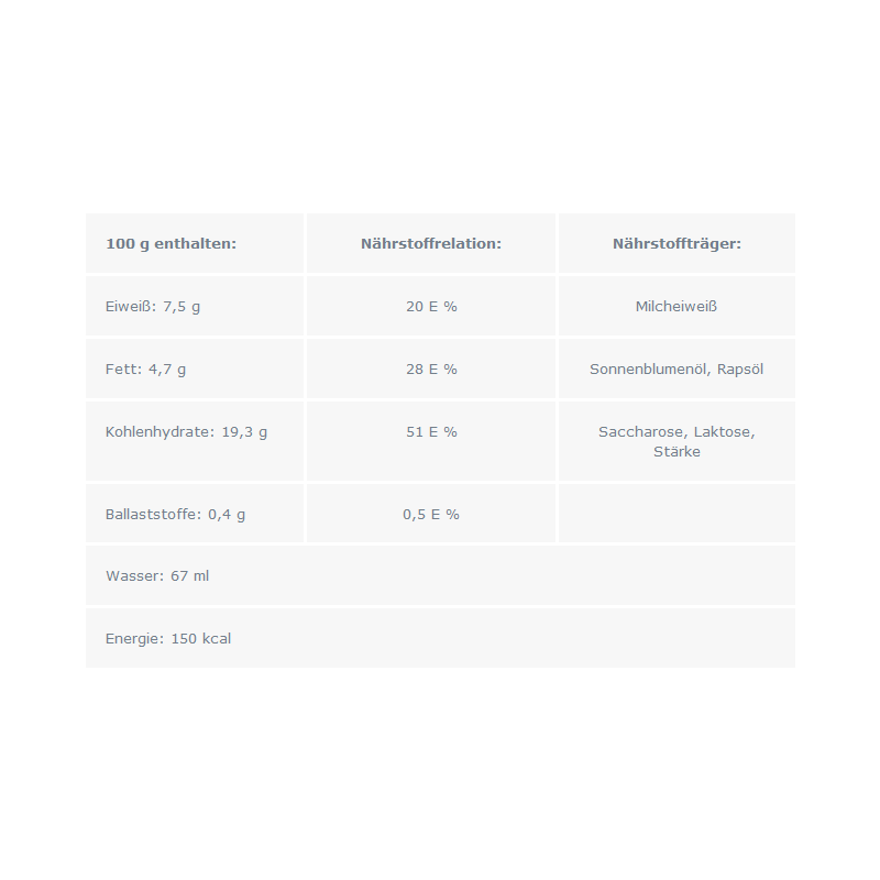 Lemon: Wasser, Zucker, Molkeneiweiß, fermentiertes Magermilchpulver, pflanzliche Öle (Rapsöl, Sonnenblumenöl), modifizierte Stärke, Säureregulator (E 270), Calciumlactat, Maltodextrin, Verdickungsmittel (E 440), Aromen, Emulgatoren (E 471, Sojalecithin), Cholinhydrogen-tartrat, Vitamin C, Natriumchlorid, Eisenpyrophosphat, Zinksulfat, Magnesiumoxid, Niacin, Vitamin E, Manganchlorid, Pantothensäure, Kupfersulfat, Vitamin B2, Vitamin B6, Natriumfluorid, Vitamin B1, Vitamin A, Folsäure, Chromchlorid, Natriumselenit, Kaliumjodid, Vitamin K1, Natriummolybdat, Biotin, Vitamin D3, Vitamin B12.
